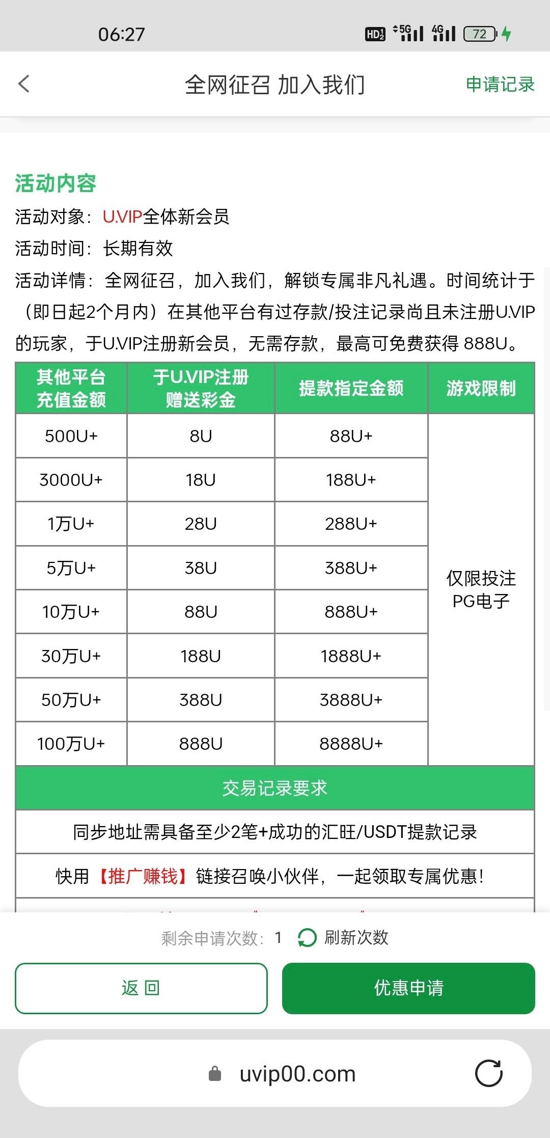 我领到了18U打到了188正在出款中,不知道能不能到网址U.VIP