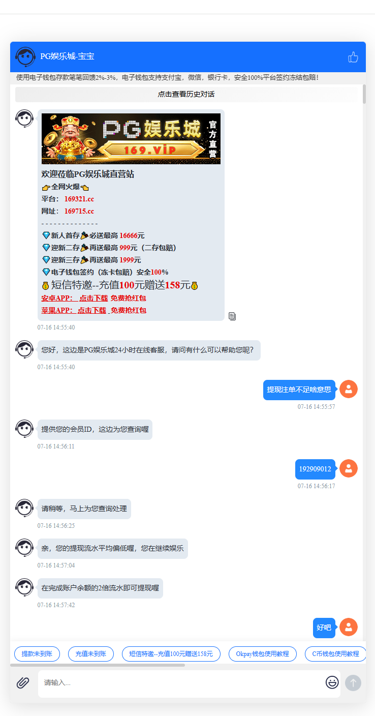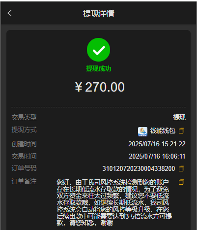刚玩第二天就说长期存取款低流水,这种睁眼说瞎话的平台还不是黑台吗?打电子打完流水提款就说流水低罚水2倍,后面打完2倍水提钱包等了40分钟左右才到账,估计这40分钟就是在考虑你有没有利用价值吧,这种台子玩不得