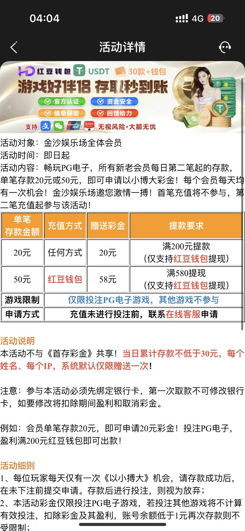 注意审题每天第二笔充值20起才能申请,可以先冲10再充20,相当于50打200起提无上限,国内网可能被屏蔽 进不去可以开vpn限制是提红豆钱包打PG。只分享风险自理https://www.aa8087.cc