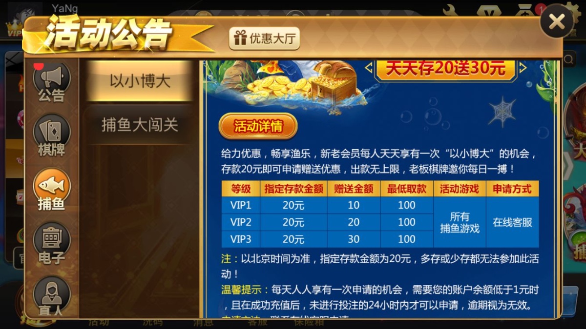 每日可以参加捕鱼以小博大 存款20+10 最低满100即可提现 只能捕鱼