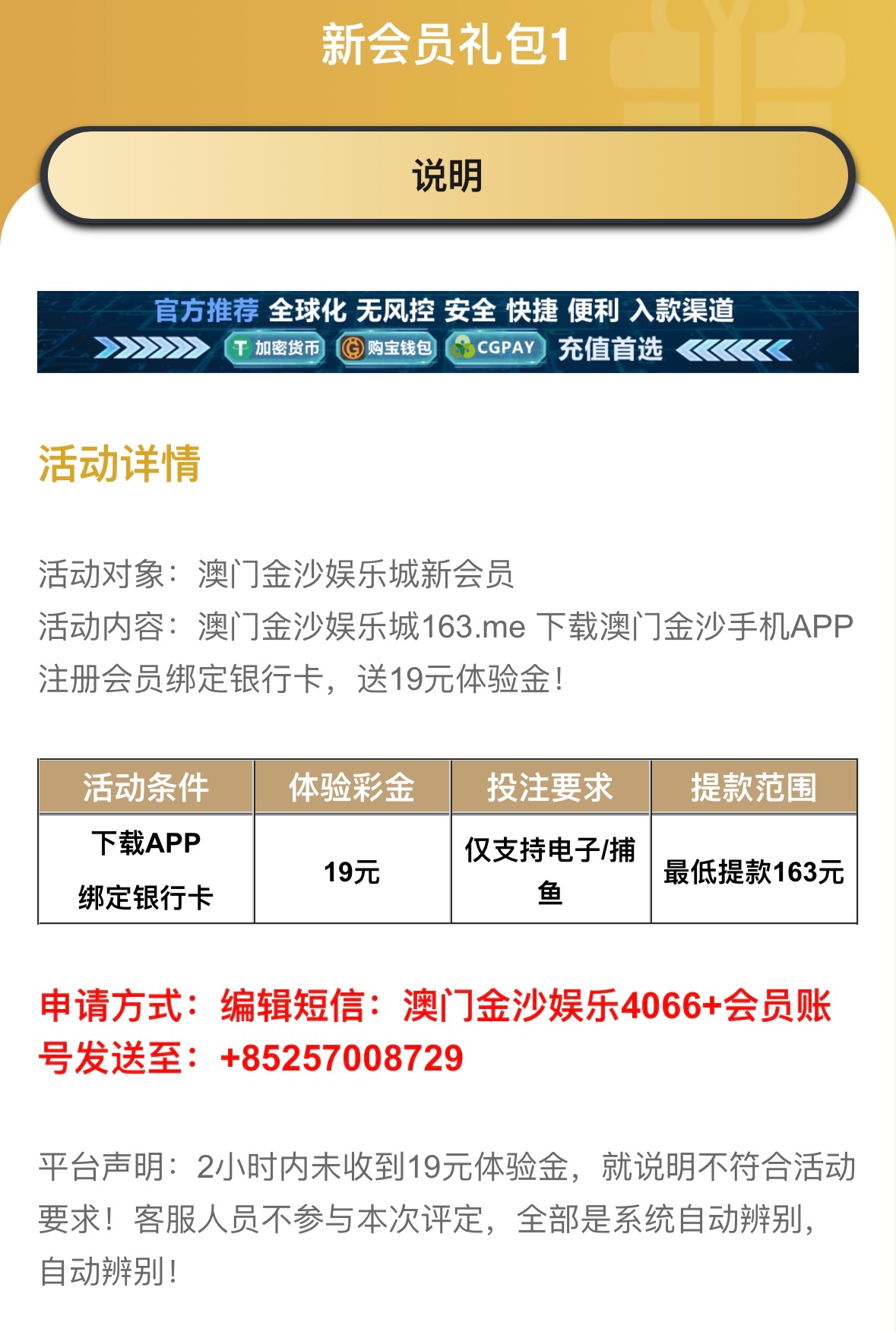 新用户下载app注册绑卡 按照要求自助发送短信领取19元彩金 这种基本都送 限制游玩电子捕鱼类游戏 最低提款163元 电信卡不用去了发不了国外短信