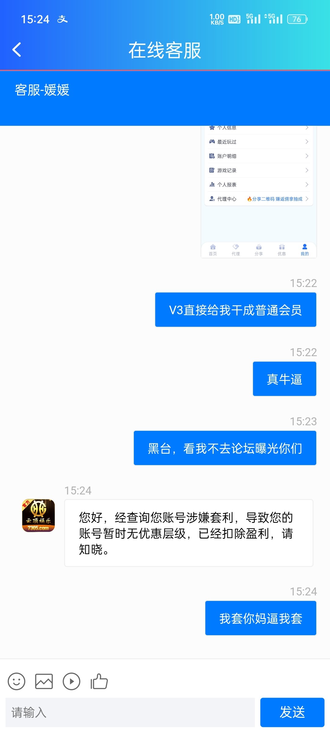 输不起的台子,之前有个新人领18的活动,领了之后没卸载,一直在这个平台玩,也是输多赢少,天天领了40块彩金,打到521提现不让提,说我套利,玩不起的玩意,大家注意就行了。