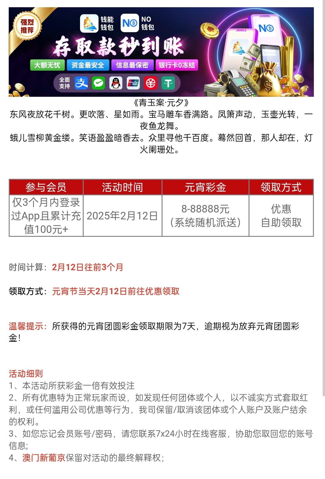 老用户三个月内有充值过100+的下载APP去领取这个彩金,具体自测吧。